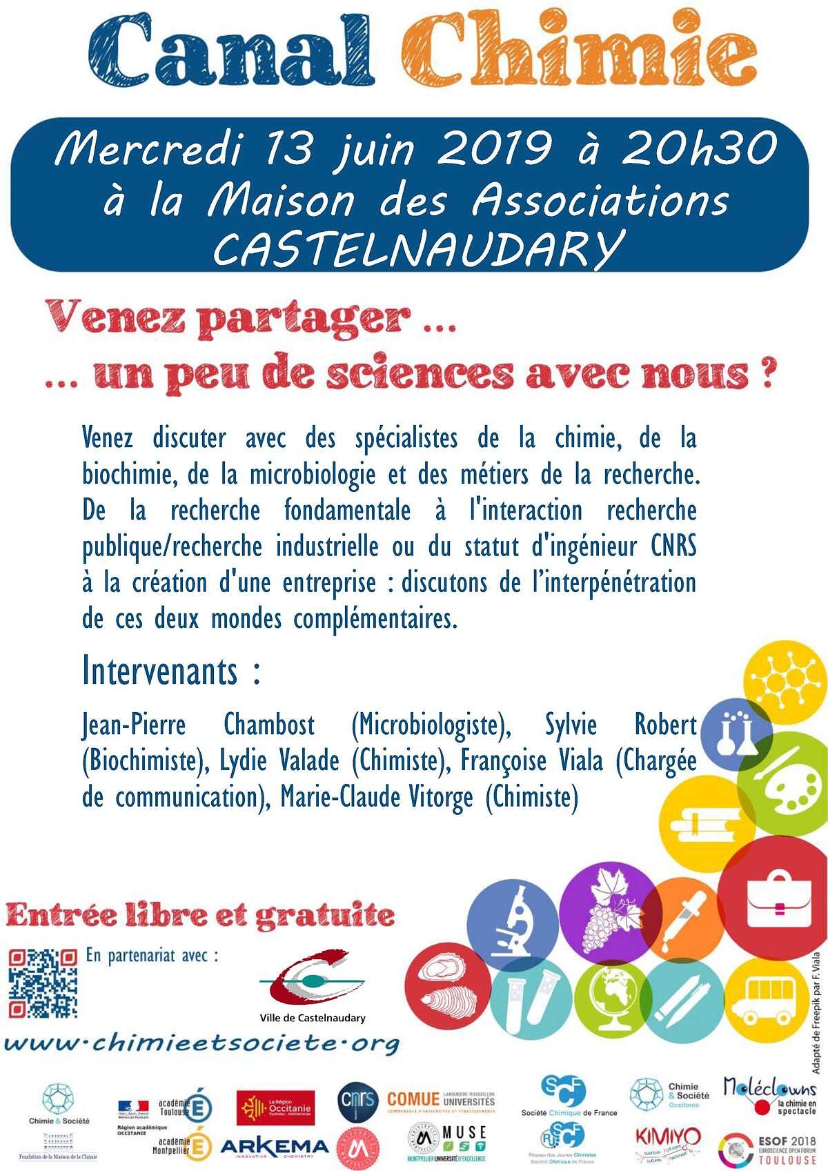 Dans le cadre de « Canal Chimie* », le café scientifique proposé le mercredi 13 juin à 20h30 à la salle Lauragais de la Maison des Association à Castelnaudary vous permettra de rencontrer et d’échanger avec les cinq scientifiques qui animeront les ateliers de la caravane de la chimie à l’école primaire prosper Estieu, le 14 juin toute la journée.