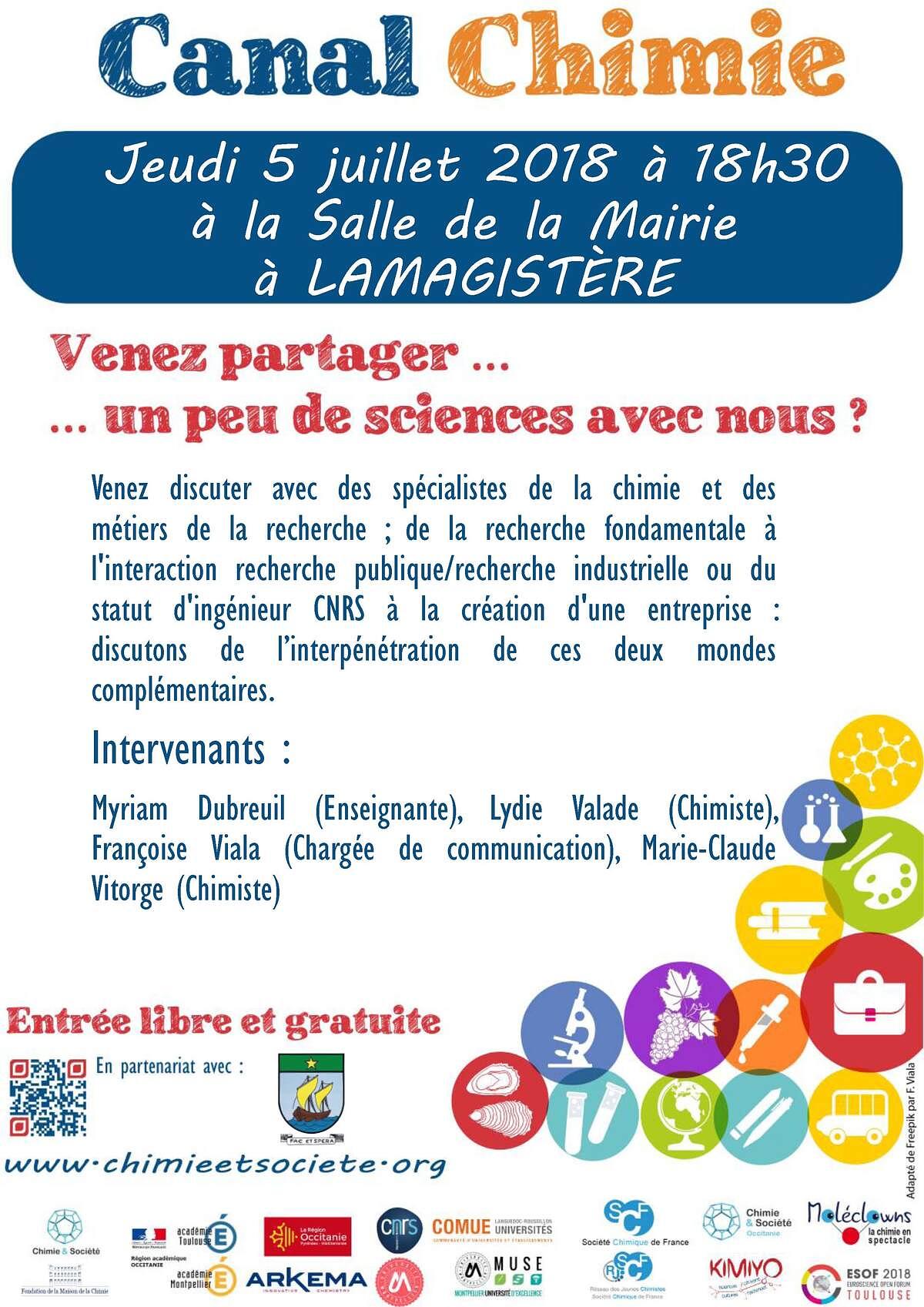Dans le cadre de « Canal Chimie* », le café scientifique proposé le jeudi 5 juillet à la salle de la Mairie de Lamagistère vous permettra de rencontrer et d’échanger avec les quatre scientifiques qui auront animé, ce même jour, les ateliers de la caravane de la chimie à l’école primaire de Lamagistère.