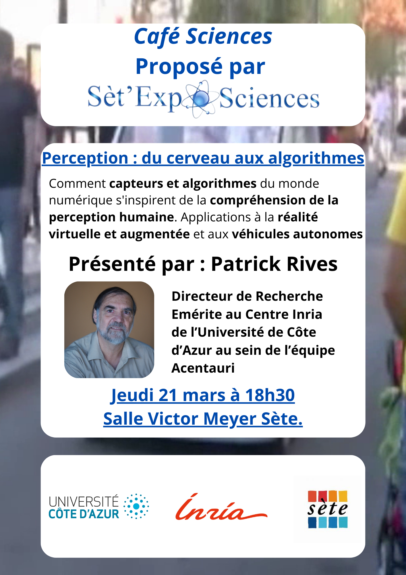 Patrick Rives, INRIA Sophia Antipolis, animera une conférence qui présentera comment les capteurs et algorithmes du monde numérique s'inspirent de la compréhension de la perception humaine.