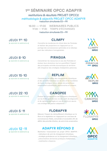 L’Observatoire pyrénéen du changement climatique (OPCC), ses associés et ses partenaires dans le cadre du projet POCTEFA ADAPYR, vous proposent de participer au cycle de séminaires en ligne à partir du 𝗝𝗘𝗨𝗗𝗜 𝟭𝗲𝗿 𝗢𝗖𝗧𝗢𝗕𝗥𝗘 𝟮𝟬𝟮𝟬 de 16h à 17h30.