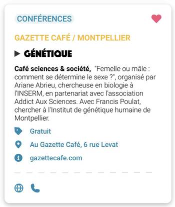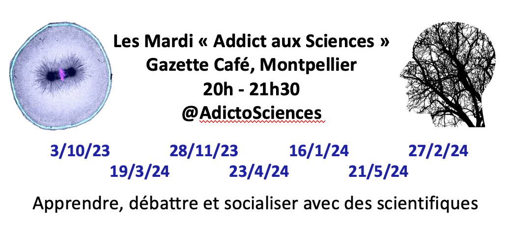 L'association "Addict aux Sciences Montpellier Occitanie" vous propose une conférence au Gazette café une fois par mois. Venez écouter les scientifiques de notre région vous parler des recherches qui les passionnent. Dans ce contexte propice aux échanges informels, vous pourrez leur poser toutes vos questions.