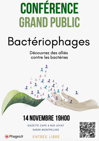 Profitant de la venue dans notre région des spécialistes à l'occasion du colloque annuel du Réseau Bactériophages France qui se tiendra à Sète (12-14 nov), une conférence grand-public sera animée par l'équipe montpellieraine CNRS dirigée par Rémy Froissart ainsi que des experts français du domaine et membres du réseau Phages.fr, dont deux médecins praticiens : Dr B. Gaborieau (réanimateur, APHP Université Paris Cité Paris) et Dr C. Eckert (bactériologie médicale, APHP Sorbonne-Université Paris) et le scientifique F. Clavijo (Chercheur CIRAD-PVBMT, La Réunion).