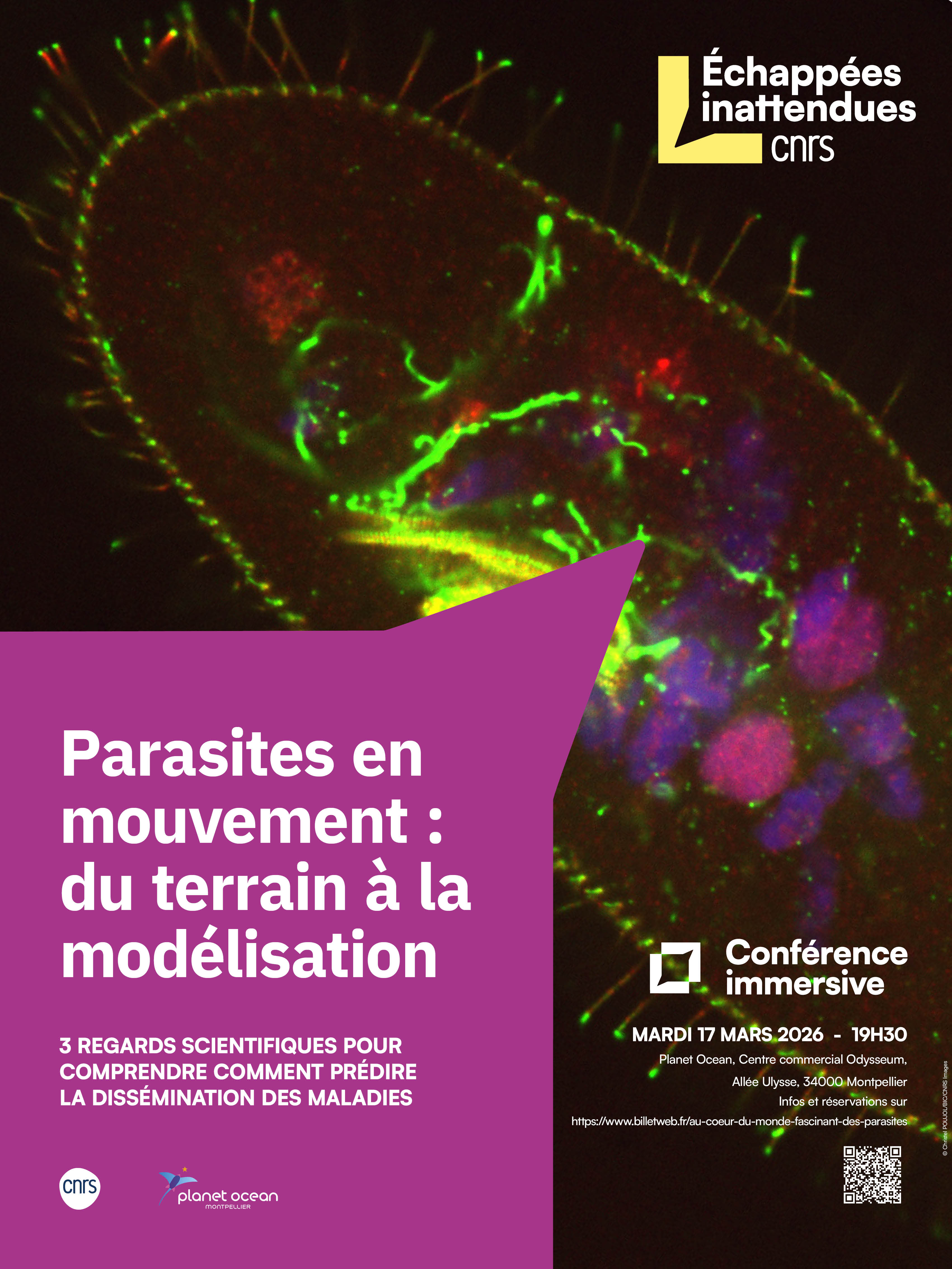 Les évènements « Les Echappées inattendues du CNRS » sont une invitation à l’exploration, à la découverte à travers la rencontre et le partage avec des scientifiques. Le temps d’une soirée, au sein du dôme planétaire de Planet Ocean, le public sera guidé par la voix de trois scientifiques et immergé au coeur d’images artistiques animées pour découvrir cette thématique autour de l’écologie, des parasites et des maladies émergentes. Karen McCoy, chercheuse au CNRS, écologue spécialiste des interactions hôte-parasite, Oliver Kaltz, chercheur CNRS en écologie évolutive, et Sarah Grosjean, ingénieure d’études CNRS en écologie évolutive parleront de leurs travaux.