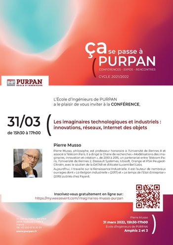 Pierre Musso donnera une conférence le jeudi 31 mars 15h30-17h sur "Les imaginaires technologiques et industriels : innovations, réseaux, Internet des objets" à l'INP Purpan.