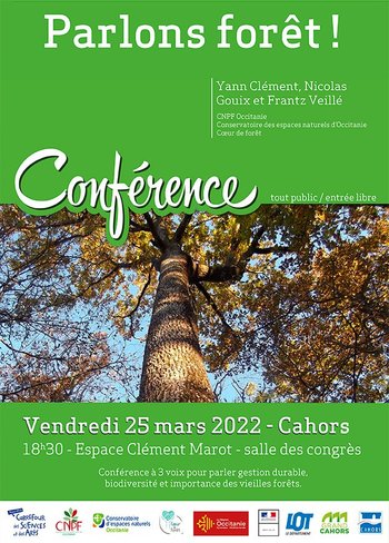 Le vendredi 25 mars 2022 à 18h30 à l’espace des congrès Clément Marot à Cahors, nous vous proposons une conférence gratuite et ouverte à tous sur le thème de la forêt. Une conférence à trois voix pour parler gestion durable, biodiversité et importance des vieilles forêts. À qui appartient-elle ? Comment est-elle gérée ? Pourquoi y a-t-il des coupes rases ?