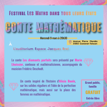 Dans le cadre du festival "Les maths dans tous leurs états" l'association Les Maths en Scène vous propose une soirée conte et musique à l'auditorium Espace Jacques Brel le 9 mars à 20 h 30 à Castanet-Tolosan.