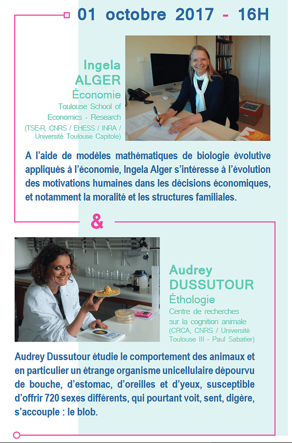 Lors du premier café débat l’économiste Ingela Alger de Toulouse School of Economics - Research et l’éthologue Audrey Dussutour du Centre de recherches de cognition animale vous parleront de leur recherche et de leur parcours.