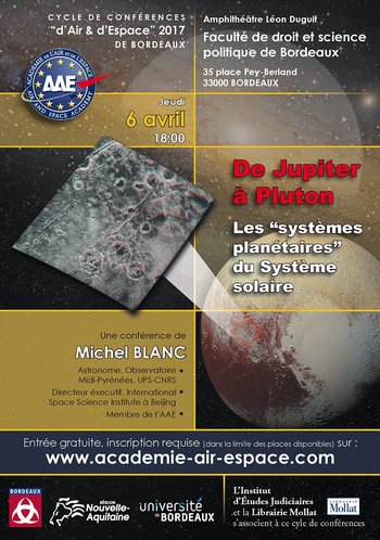 Début de la conférence à 18h Par Michel BLANC, astronome, Observatoire Midi-Pyrénées,UPS-CNRS ; directeur exécutif, International Space Science Institute à Beijing, membre de l’AAE L’avènement des sondes interplanétaires a permis d’entreprendre une exploration in situ détaillée de ces « petits systèmes planétaires dans le grand » que sont les systèmes des planètes externes du Système Solaire. Chacune de leurs composantes avec un luxe de détails inégalé : atmosphères, lunes de glace et de feu, geysers et volcans, anneaux, magnétosphères et même aurores polaires. Nous progressons rapidement dans la compréhension de leur fonctionnement, et aussi de la façon dont ils se sont formés. Et nous commençons à faire des plans précis pour aller chercher des traces d’un éventuelle Vie extraterrestre au sein même de ces « Lunes océans » de Jupiter et Saturne que sont Europe et Encelade. Nous illustrerons ces propos par les résultats de l’exploration de Jupiter par Galiléo puis Juno, de Saturne par Cassini ainsi que du survol du petit système planétaire de Pluton, à la richesse et à la diversité inattendues, par la sonde New Horizons le 14 juillet 2015. Elle évoquera les missions en préparation pour poursuive et approfondir l’exploration des systèmes planétaires, non seulement dans le système solaire, mais aussi autour des milliers d’étoiles de notre voisinage galactique immédiat qui possèdent un cortège de planètes.