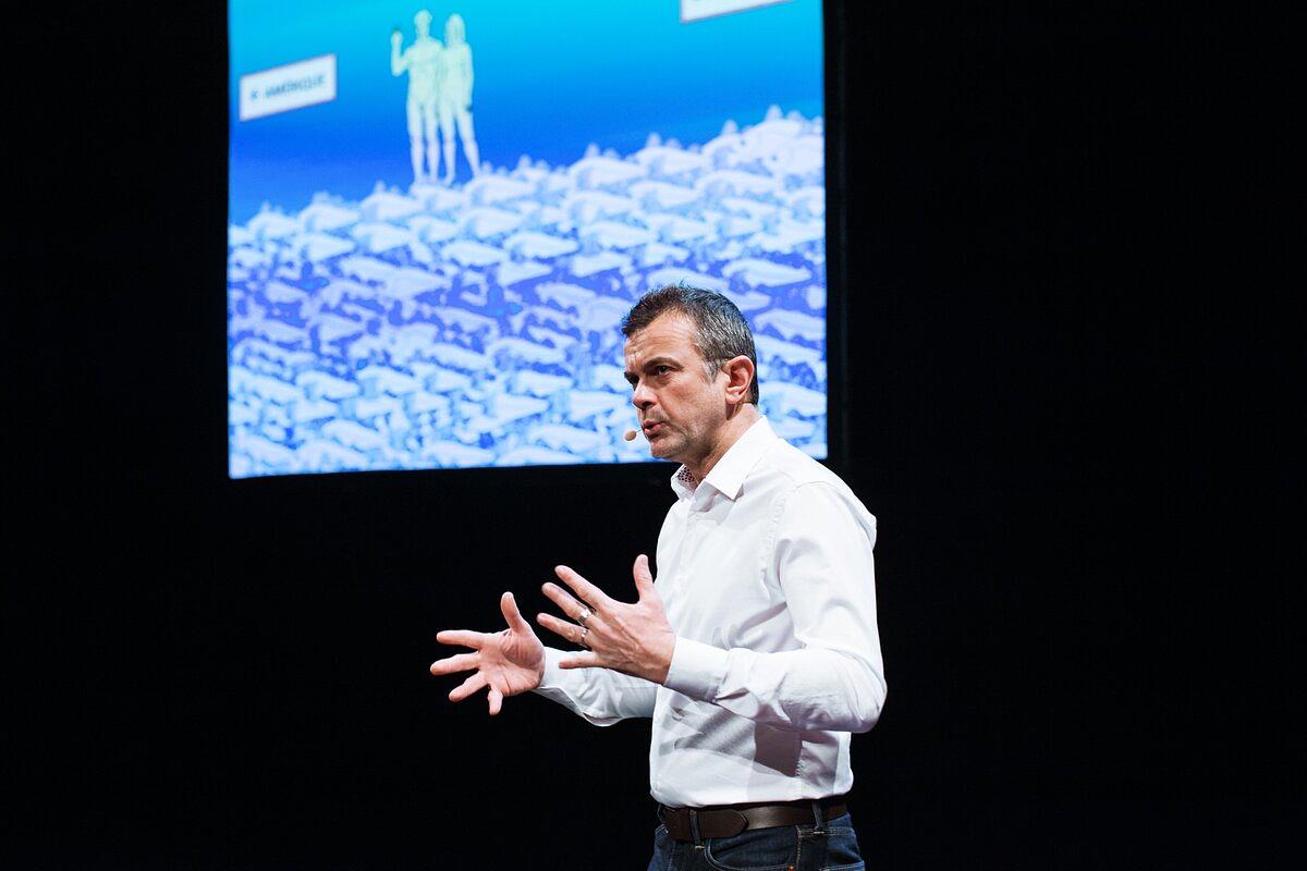 Agrégé de géographie, cet ancien prof a quitté l’Education nationale pour se consacrer au théâtre. Désormais acteur et metteur en scène, Frédéric Ferrer s’est rendu célèbre avec des conférences-spectacles sur le réchauffement climatique. Une « dramaturgie du PowerPoint » aussi drôle qu’engagée.