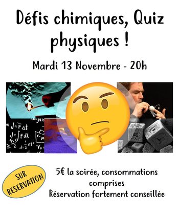 Toutes ces questions et celles que vous ne vous posez pas trouveront une réponse Mardi 13 Novembre à la Soirée "Défis chimiques & Quiz physiques". Venez vous affronter en équipe à l'Eurêkafé autour d'images mystères, de questions de rapidité et de petites énigmes !