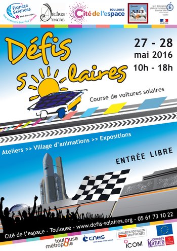 Organisés par les associations Planète Sciences Midi-Pyrénées,Délires d’encre, Les Amis de la Cité de l’espace et en partenariat avec lelycée Déodat de Séverac et la Cité de l’espace, les Défis Solaires sont depuis plus de 10 ans un formidable projet de culture scientifique technique et industriel qui propose aux jeunes de la région Midi-Pyrénées de se lancer dans un projet d’innovation en développement durable autour des énergies et du transport.