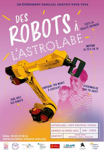Le temps d’une journée, l’Astrolabe Grand-Figeac se transforme en immense laboratoire. Des robots, des machines et du matériel numérique de toutes tailles et de toutes sortes seront présentés pour que vous puissiez les découvrir, mieux les comprendre mais surtout pour que vous puissiez les utiliser !