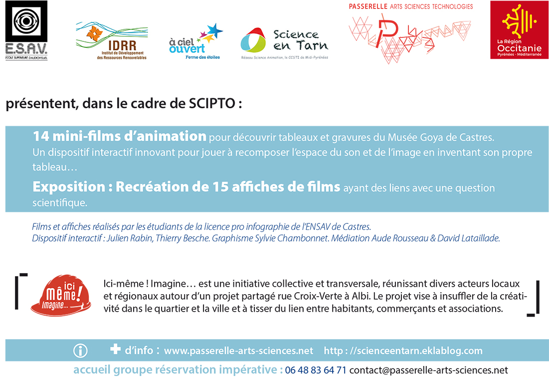 Dans le cadre du festival Science et CInéma Pour TOus (SCIPTO), en partenariat avec l'ENSAV Castres, l'IDRR du Tarn , A Ciel Ouvert et Avec le soutien de la région Occitanie, Science en Tarn et Passerelle Arts Sciences Technologies vous propose: