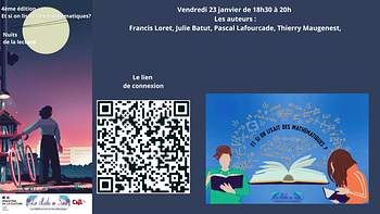Ce vendredi 23 janvier de 18h30 à 20h, Julie Batut, Pascal Lafourcade, Francis Loret, Thierry Mougenest et Houria Lafrance vous feront découvrir à travers des lectures la richesse et la beauté des mathématiques à travers des personnages, des objets, des anedoctes.