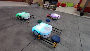 Les Thymio sont des petits robots programmables permettant de paramétrer plusieurs éléments comme les moteurs, les lumières ou les sons. Le logiciel dispose de différentes interfaces permettant ainsi de programmer les robots selon différents niveaux.