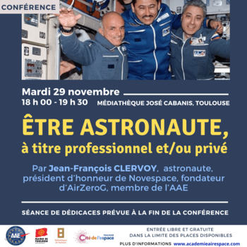 Conférence organisée par l' Académie de l'air et de l'espace en partenariat avec la Cité de l'espace, la Médiathèque José Cabanis et la Mairie de Toulouse.