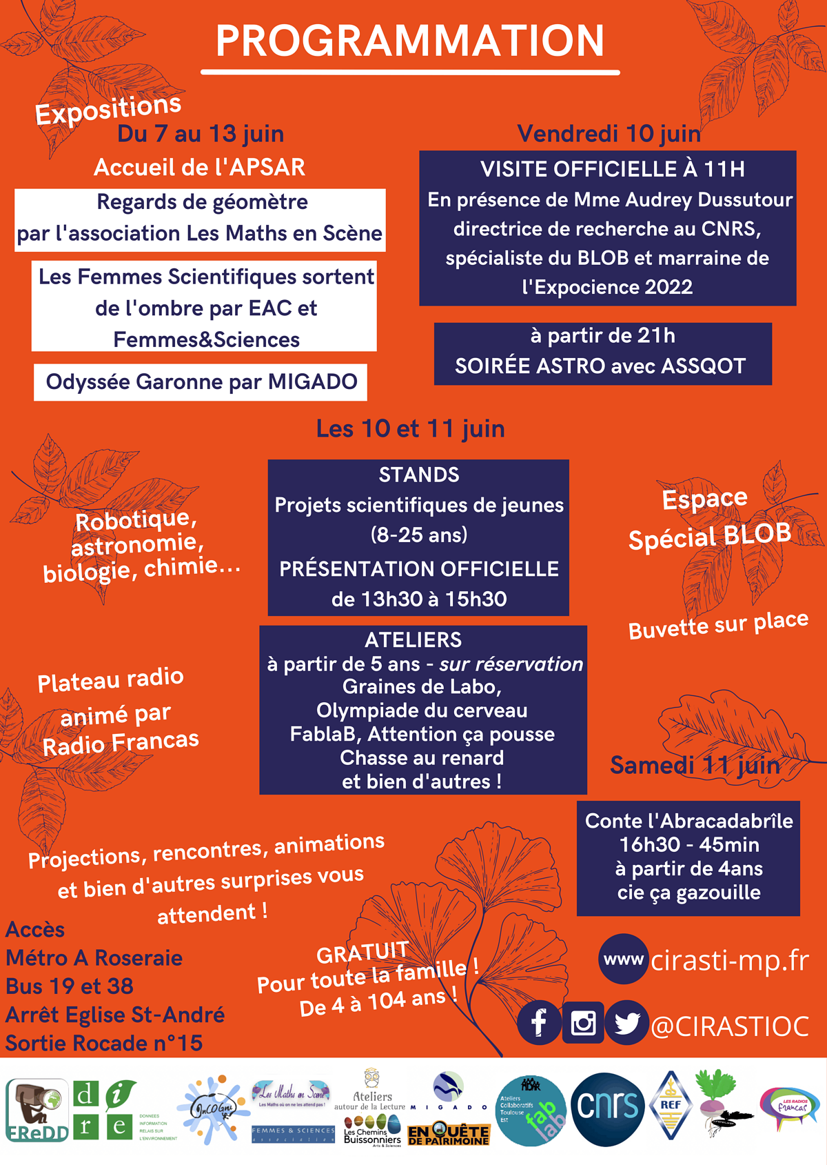 Au programme, des stands avec des thématiques variées puisqu'il y aura des projets autour du Blob (évidemment), de l'astronomie, de la robotique, de l'environnement, de la chimie, de la physique et de la santé avec des jeunes venant de l'Aude, du Lot, du Tarn, de la Haute-Garonne mais également de l'international avec des projets luxembourgeois, allemands, espagnols et marocains.