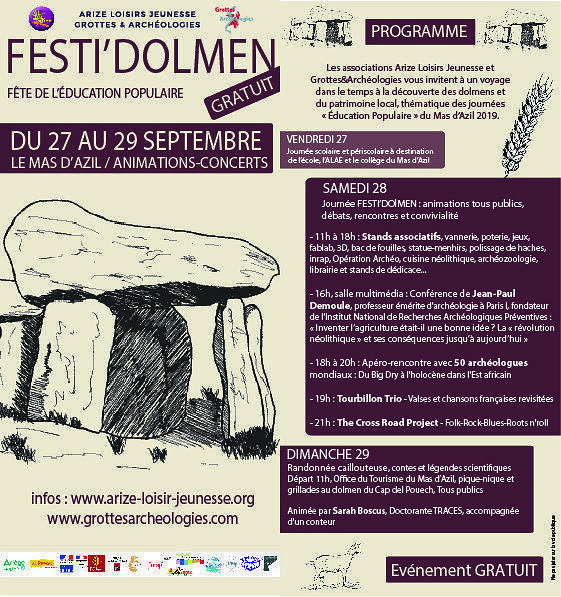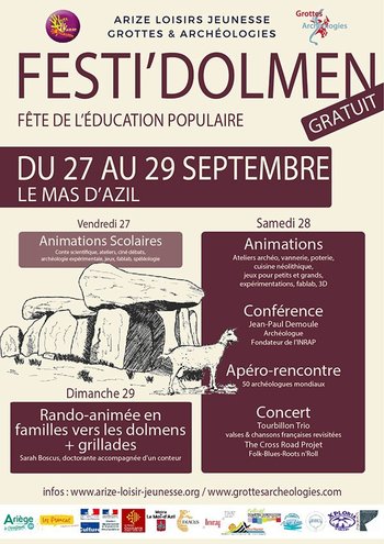Les associations Arize Loisirs Jeunesse et Grottes&Archéologies vous invitent à un voyage dans le temps à la découverte des dolmens et du patrimoine local, thématiques de ces journées « Education Populaire » du Mas d’Azil 2019 !