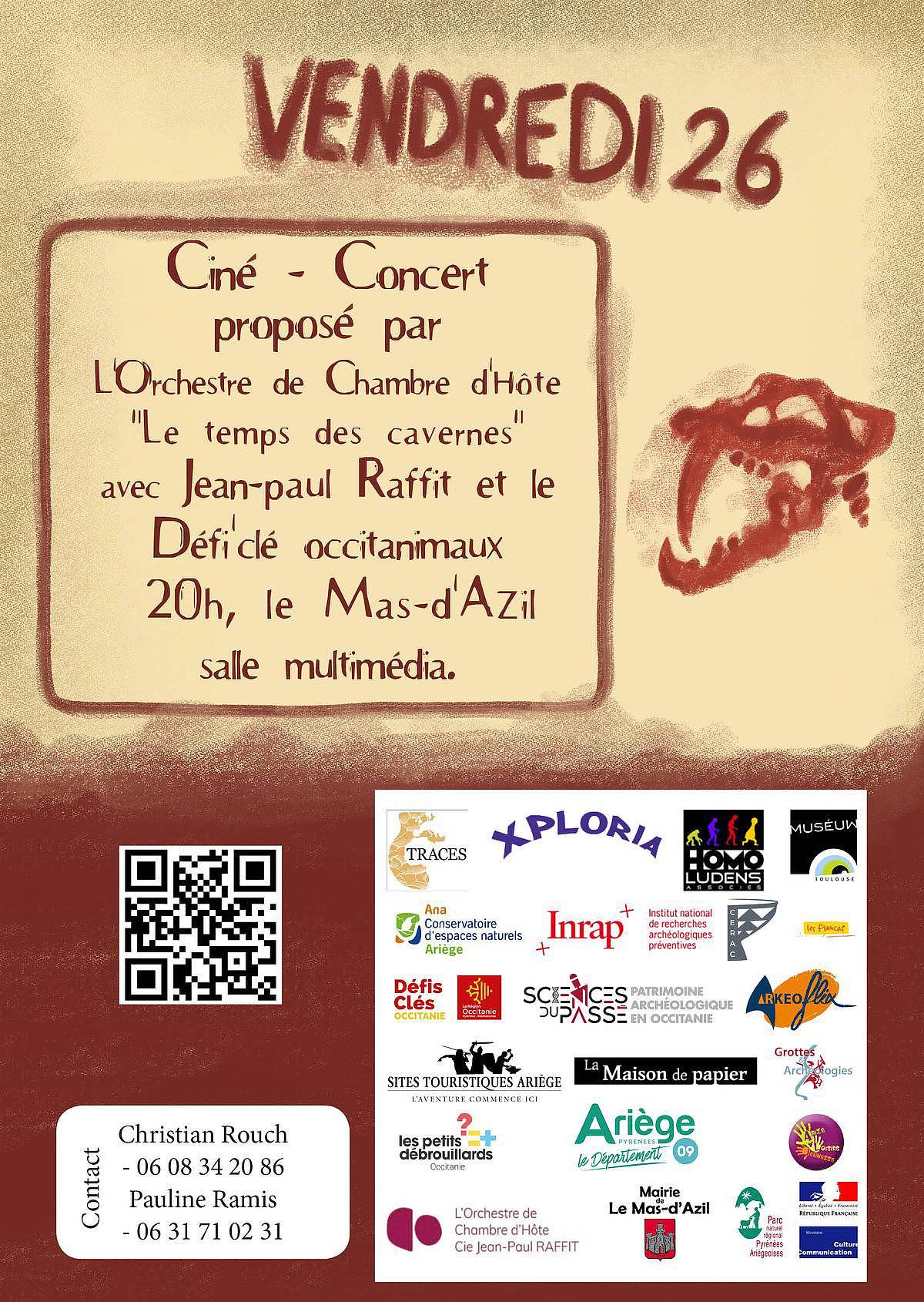 Jean-Paul Raffit et son Orchestre de Chambre d'Hôte vous présentent C.A.V.E.R.N.ES , ce ciné-concert vous plonge dans l’histoire des premiers préhistoriens, découvreurs des grottes de Niaux, de Lombrives, de Bédaillhac et du Mas d’Azil, accompagnés par des archéologues préhistoriens.