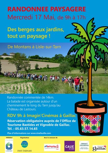 Départ du cinéma de Gaillac vers Montans. La balade est organisée autour d’un cheminement le long du Tarn jusqu'au château de Lastours. Tout au long du parcours (14km environ), découverte de la plaine alluvionnaire, de points de vue remarquables, d’aménagements, d’anciens moulins, du vieux port de Lisle-sur-Tarn et du château de Lastours. Les accompagnateurs (architecte/paysagiste, naturaliste, technicien de rivière) partagent anecdotes et connaissances. Le pique-nique, fourni, est partagé en chemin. Retour en bus à Gaillac pour la soirée inaugurale de Cinéfeuille.