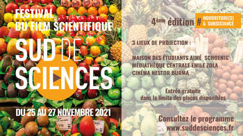 L'édition 2021 du Festival Sud de Sciences se déroulera du 25 au 27 novembre 2021 sur la ville et la métropole de Montpellier. La thématique de cette 4ème édition sera "Nourriture(s) & Subsistance".