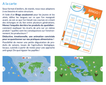 Dans le cadre du projet Planet@liment porté par l'Institut de Recherche et de Développement (IRD), Les Ateliers ludosophiques et l'association Kimiyo, nous vous accompagnons dans la mise en place d'une animation intergénérationnelle autour de l'alimentation durable et de la remise en questions de nos pratiques alimentaires.