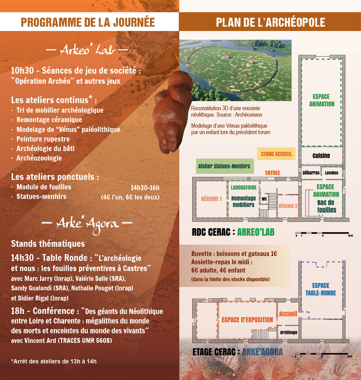 Toute la journée, des animations feront découvrir de manière ludique et pédagogique l’archéologie (atelier fouilles, statues-menhirs, modelage en argile…) pour le jeune public. L’après-midi, une table-ronde exceptionnelle sera organisée avec des acteurs de l’archéologie préventive afin de comprendre son fonctionnement et de découvrir les opérations réalisées sur Castres. Ainsi, l’INRAP sera représenté par le délégué du Directeur adjoint scientifique et technique Midi-Pyrénées Marc Jarry accompagné par les archéologues Nathalie Pouget et Didier Rigal, ainsi que des agents de la DRAC Sandy Gualandi et Valérie Salle. Ils présenteront leur rôle respectif dans l’archéologie et les premiers résultats des diagnostics et des fouilles réalisés sur la commune en 2018. La journée se clôturera avec la conférence de Vincent Ard (UMR Traces – Université de Toulouse Jean Jaurès) portant sur le mégalithisme et les enceintes néolithiques.