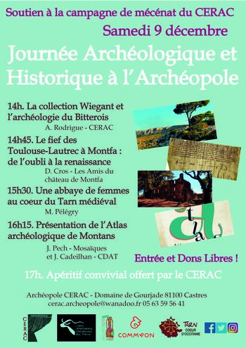 En soutien à la campagne de mécénat du CERAC Archéopole, des acteurs du patrimoine tarnais vous proposent quatre conférences sur l'actualité des recherches archéologiques et historiques.