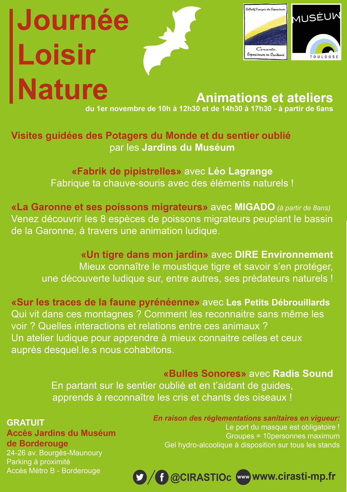 La Journée du Loisir Nature se déroulera le dimanche 1er novembre 2020 de 10h à 12h30 et de 14h30 à 17h30 aux Jardins du Muséum de Borderouge à Toulouse.
