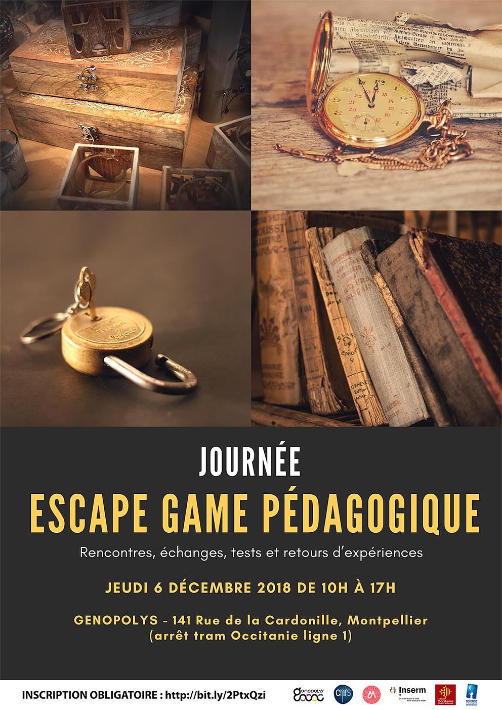 Assistez le jeudi 6 décembre prochain à une journée de rencontres consacrée aux Escape Games pédagogiques à Genopolys Montpellier (tram ligne 1 - arrêt Occitanie) de 10h à 17h.