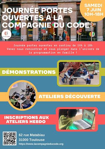 La Journée Portes ouvertes de La Compagnie du Code revient samedi 7 juin de 10h à 18h, à Toulouse à la Place du c0de, 62 rue Matabiau Toulouse !
