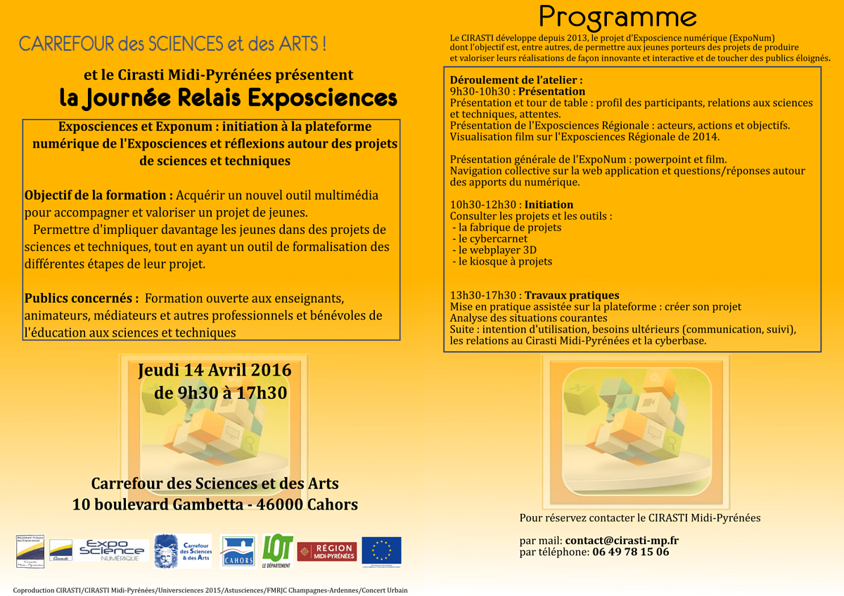 Carrefour des Sciences et des Arts accueille le CIRASTI MP (collectif inter associatif pour la réalisation d’activités scientifiques et techniques à l’international), pour une journée gratuite de formation sur les Exposciences régionales et l'Exponum, le jeudi 14 avril de 9h30 à 17h.