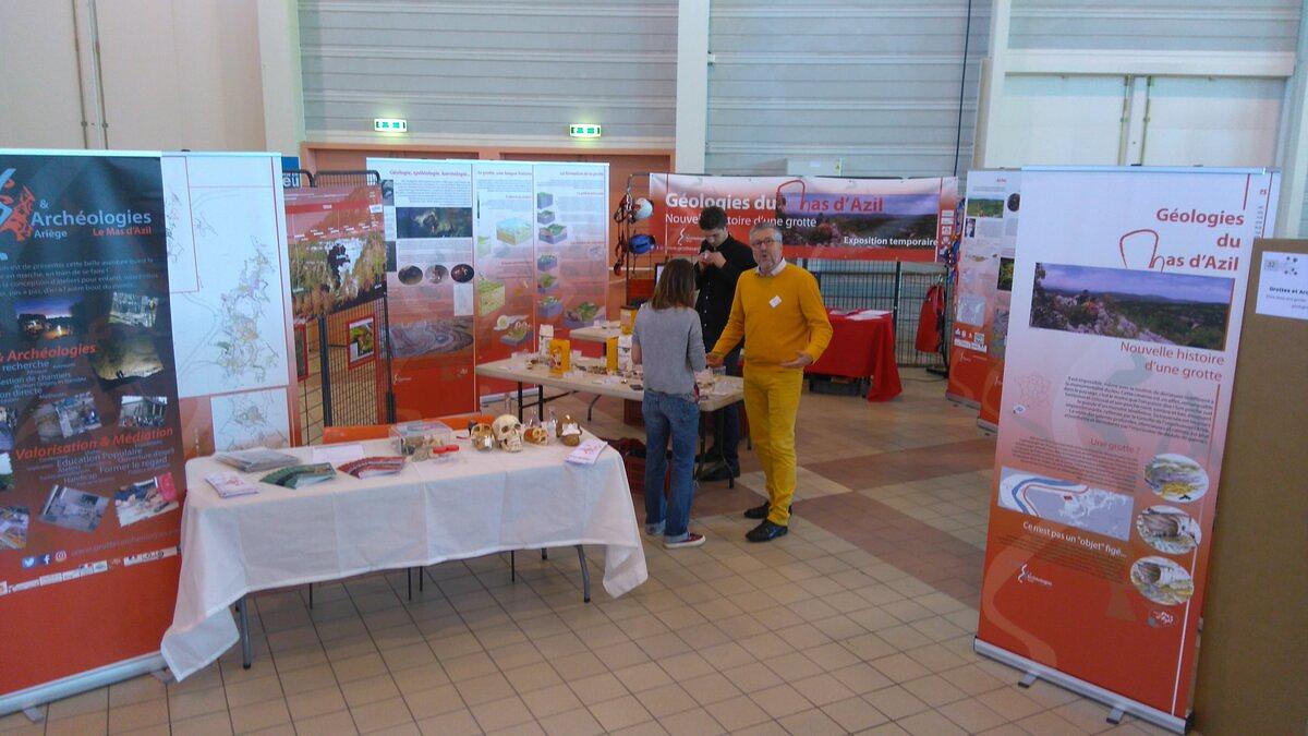 Stands : Grottes&Archéologies, INRAP, Xploria, Fouilles du Mas d'Azil, Archéolèze, Spéléologie, Couserans Médiéval, Tribu de Magda, Le propulseur, Office du tourisme, Mille Pattes, AJCA, laboratoire TRACES, association Pyrène...
