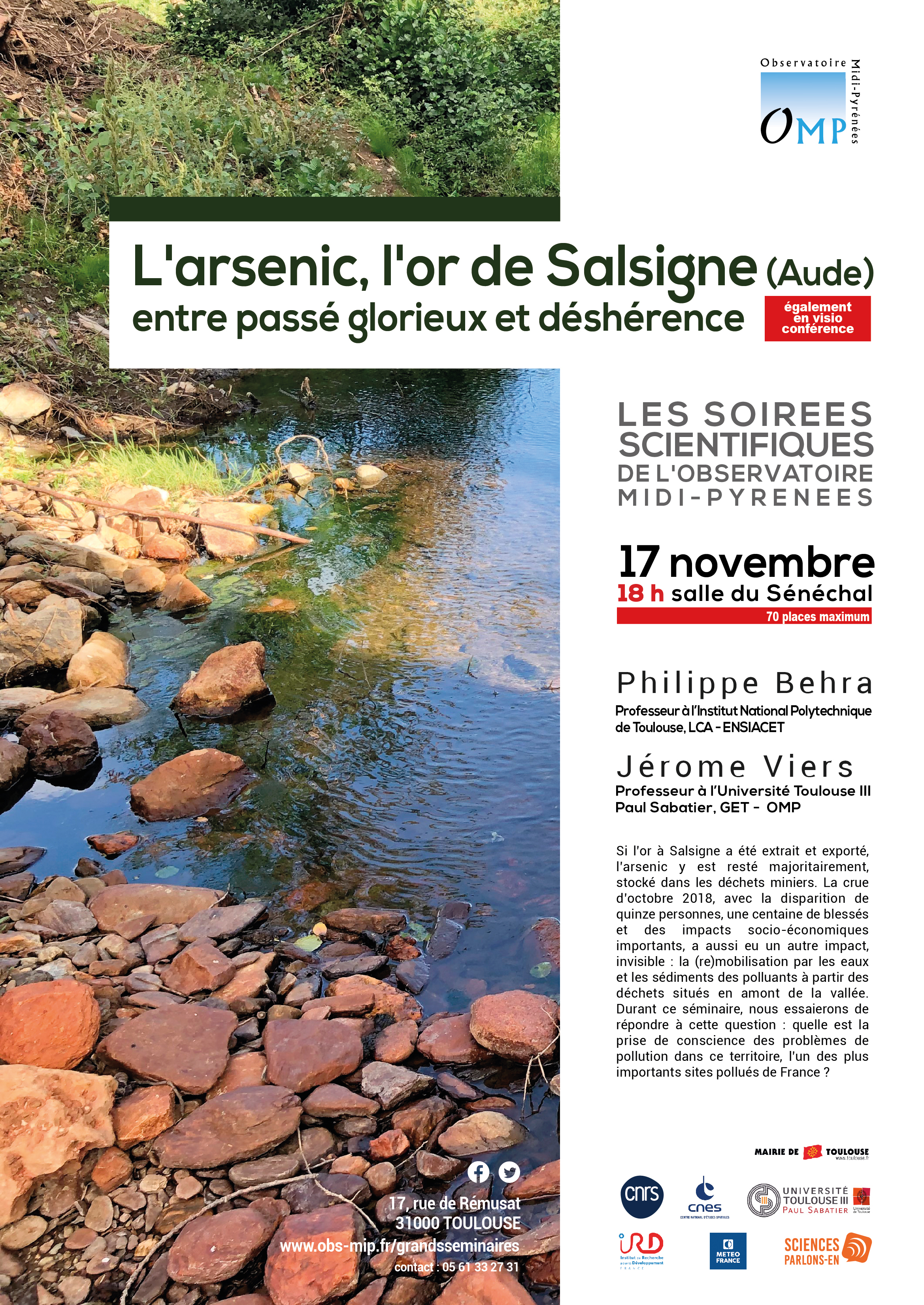 La région de Salsigne renvoie dans l’imaginaire collectif à deux éléments : l’or et l’arsenic. Cependant, si l’or a été exploité et exporté, l’arsenic pour la majeure partie a été laissé sur place, stocké dans les déchets miniers. Depuis la crue du 14 au 15 octobre 2018, de nombreuses questions se posent. Parmi celles-ci, existe-t-il aujourd’hui une réelle prise de conscience des problèmes de pollution dans ce territoire, l’un des plus importants sites pollués en France ? Cette question mérite d’être posée suite au déluge qui s’est abattu sur la vallée de l’Orbiel cette nuit d’octobre 2018. Quinze personnes ont perdu la vie, une centaine d’autres ont été blessées, sans compter les impacts sociaux, socio-économiques et agricoles. Mais cet évènement dramatique a eu un autre impact, invisible : la (re)mobilisation de nombreux polluants, dont l’arsenic, à partir des sources de pollutions que constituent les stockages de déchets situés en amont de la vallée. La rivière Orbiel, exutoire naturel de toutes ces sources, ne pouvait que charrier vers l’aval des eaux et sédiments contaminés. Quel est l’état de la situation actuelle ? Durant ce séminaire, nous essaierons de répondre aux nombreuses questions qui jaillissent de cette vallée suite à nos travaux.