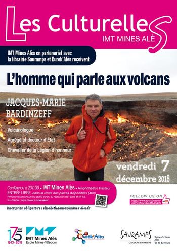 Dans le cadre de l’exposition « Terre, Planète active » consacrée aux volcans et séismes ainsi qu’aux sols, l’association Eurekales en collaboration avec l’École des Mines Alès et la librairie Sauramps organise une conférence consacrée aux Volcans qui sera présentée par Jacque-Marie Bardintzeff le volcanologue reconnu internationalement et auteur de nombreux ouvrages sur le sujet.