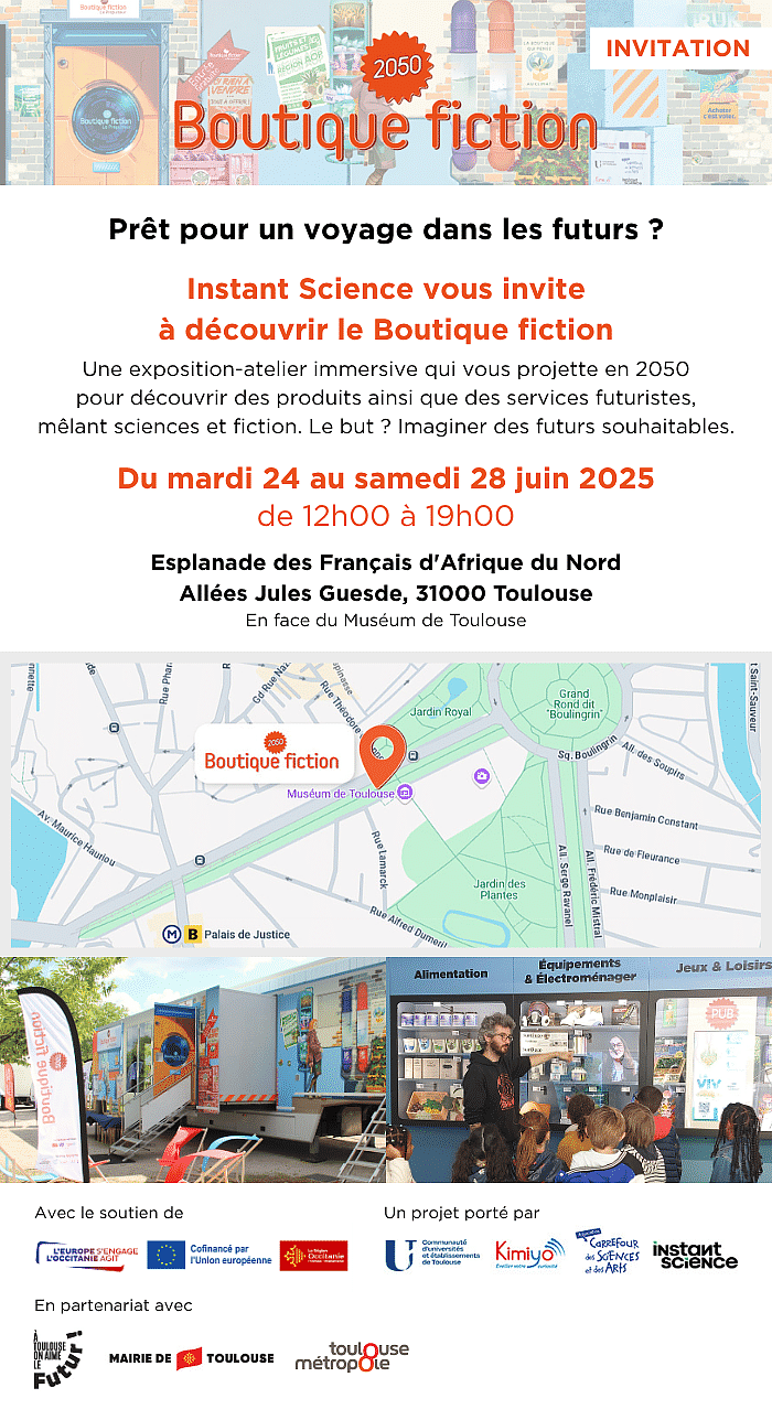 Le projet de la Boutique fiction est réalisé grâce au soutien de la Région Occitanie et des Fonds Européen de Développement Régional (FEDER), et mené en co-production avec la Communauté d’universités et établissements de Toulouse, Carrefour des Sciences et des Arts et Kimiyo.