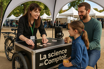 C’est un petit bar ambulant avec un concept très simple : des scientifiques qui servent à boire, et une seule règle : ici, on se fait offrir un café ou un jus de fruits, et on repart avec un petit bout de science en poche. C’est l’inverse d’une conférence traditionnelle : pas d’estrade, pas de PowerPoint, pas de poster, pas de formalisme. Juste un échange direct entre scientifiques et grand public, avec une bonne dose de curiosité et de spontanéité. Au fil de la journée, des scientifiques se relaient pour discuter de ce qu’ils explorent au quotidien — que ce soit l’eau, la Terre, la biodiversité ou même l’univers. Pour briser la glace : un petit geste, un grand sujet, lancez les dés !