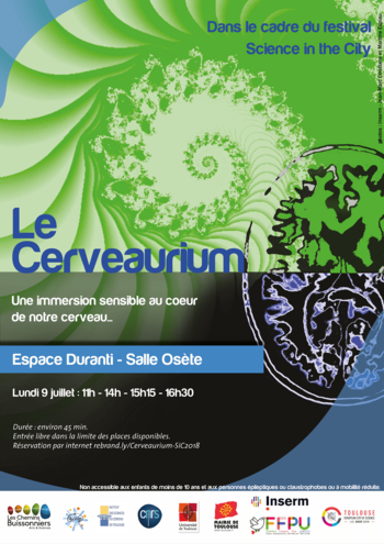 Le Cerveaurium est une animation multimédia immersive : confortablement allongés dans l’ambiance intimiste et relaxante d’un dôme gonflable, vous partirez à la découverte du cerveau. Durant 40 minutes, Estelle Cabrillac (médiatrice scientifique), Pierre Fauret (fournisseur en ondes cérébrales) et Isabelle Cirla (musicienne interprète) vous guideront dans les méandres d’un cerveau en action.