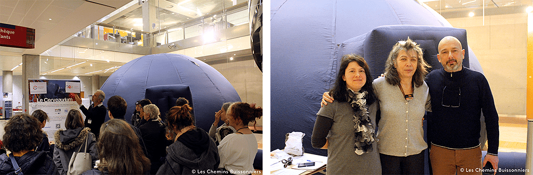 Le Cerveaurium est une animation multimédia immersive : les spectateurs·trices, confortablement allongés·es dans l’ambiance intimiste et relaxante d’un dôme gonflable, partent à la découverte du cerveau. Durant 40 minutes, Estelle Cabrillac (médiatrice scientifique), Pierre Fauret (fournisseur en ondes cérébrales) et Isabelle Cirla (musicienne interprète) vous guideront dans les méandres d’un cerveau en action.
