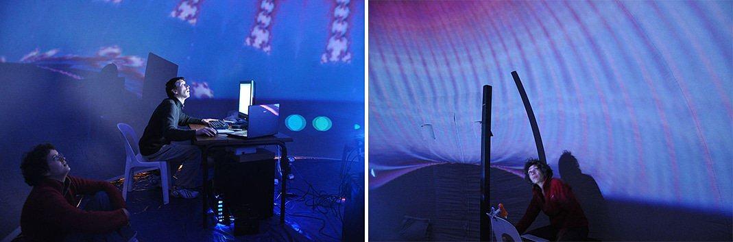 Cette expérimentation utilise une Interface Cerveau Machine (ICM) : un casque à électrodes est placé à la surface du crâne d’un des animateurs et enregistre ses ondes électriques cérébrales. Celles-ci sont ensuite transmises à un ordinateur qui les convertit en direct en animations et interactions visuelles projetées à 360° sur le dôme. Musique, images, expérimentations et commentaires deviennent ainsi les complices d’une exploration poétique et contemplative.