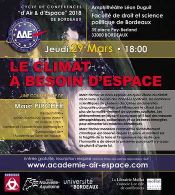 Début de la conférence à 18h Marc Pircher, président MP4S, ancien directeur du centre spatial de Toulouse, CNES, membre de l'Académie des technologies, correspondant de l'AAE. Marc Pircher va nous exposer en quoi l'étude du climat de la Terre a besoin des données spatiales. De nombreux scientifiques de plusieurs disciplines analysent les cinquante paramètres qui influencent le climat dont plus de la moitié viennent de données spatiales. Les phénomènes en jeu sont complexes et il faut des mesures atmosphériques, océaniques et sur les terres émergées pour alimenter les modèles climatiques. Marc Pircher montrera comment le réchauffement climatique est observé depuis l'Espace et insistera sur la fragilité de la Terre et l'impérieuse nécessité que l'humanité a de devoir la préserver parce qu'il n'y a pas de plan B d'après lui.