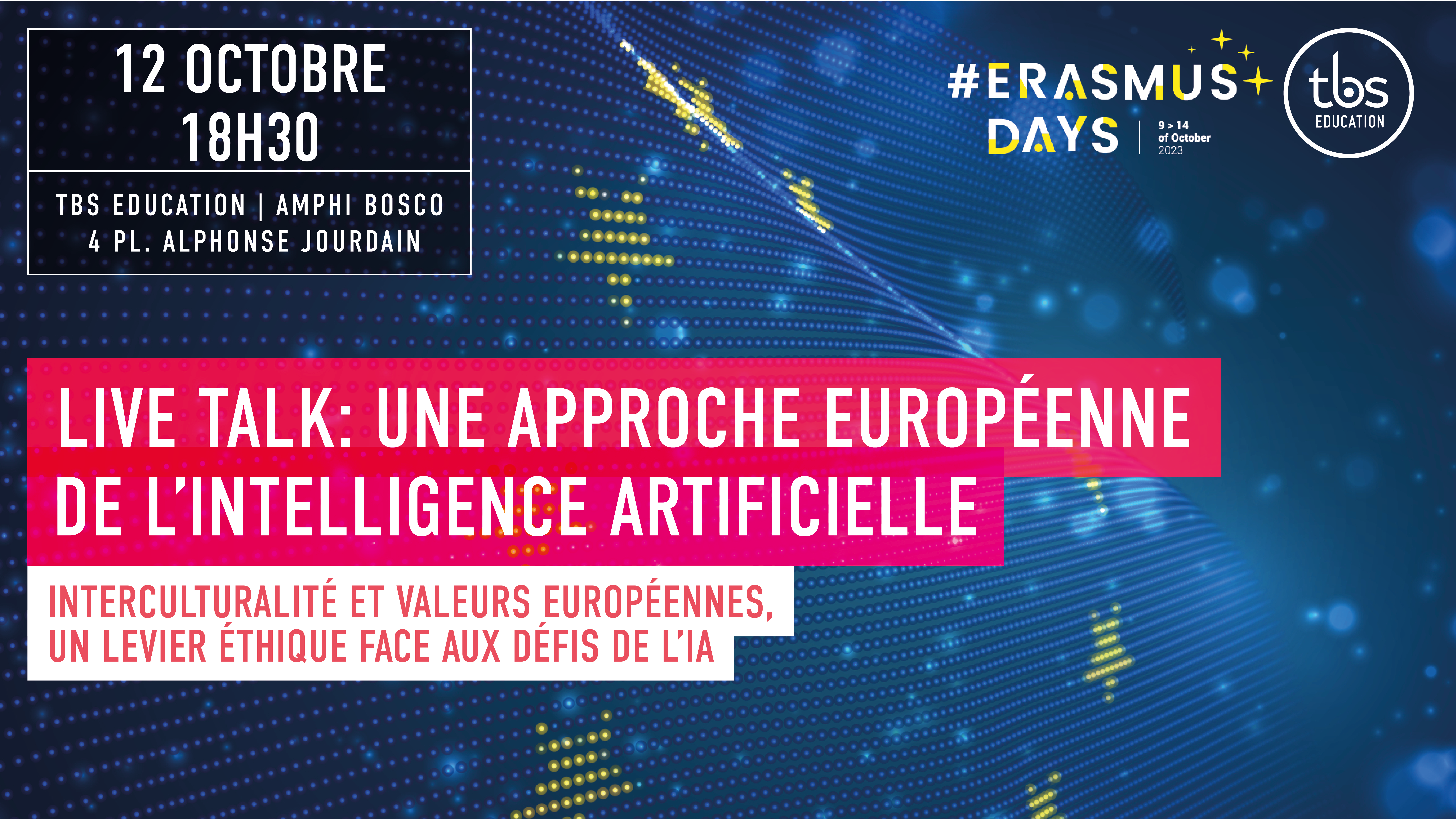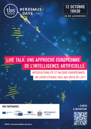 A l'occasion des Erasmus Days, TBS Education vous convie à la table-ronde : Une approche européenne de l’Intelligence Artificielle Interculturalité et valeurs européennes, un levier éthique face aux défis de l'IA ? Ce Live Talk rassemblera un panel d’intervenants qui échangeront sur les politiques et mesures prises au niveau européen pour une transition numérique respectueuse des valeurs européennes. Intervenants : - Martin Ulbrich, Commission Européenne, Chargé des affaires économiques et politiques (DG-CNECT - Unité "Développement et coordination des politiques en matière d'IA") - Kevin Carillo, Responsable du Centre d’Excellence Artificial Intelligence & Business Analytics de TBS Education - Aiad Outemsaa, IBM, Blockchain Managing Consultant - Yann Ferguson, docteur en sociologie et Expert Global Partnership on AI, ICAM Cet échange sera animé par la journaliste Valérie Ravinet avec la présence de Samuel Fosso Wamba, Directeur de la Recherche à TBS Education, qui clôturera l'événement Quand ? Jeudi 12 octobre à 18h30 Où ? TBS Education, Amphi Bosco, 4 place Alfonse Jourdain, 31000 Toulouse Comment ? Inscription obligatoire ici. |