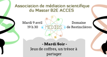 Dans le cadre des Mardis Soirs, l'association étudiante de médiation scientifique Medios vous propose de découvrir ses coffres mystères. Le trésor qu'ils renferment ? De la connaissance scientifique à l'état pur ! Nous n'allons pas vous l'apprendre, la science n'a valeur que si elle se partage. Vous devrez donc explorer ces trésors en groupe et transmettre votre savoir à d'autres en utilisant les outils de votre choix : le dessin, le théâtre, l'exposé ou le jeu par exemple. Parmi les thématiques qui seront abordées on retrouve la mycologie, la paléontologie, les énergies renouvelables, la botanique et la nutrition. En résumé, une soirée riche en enseignements tant sur le fond que sur la forme !