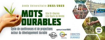 Depuis le mois d’octobre 2022, le cycle de conférences et de projections intitulé « Mots durables », organisé par la Mission Développement Durable et Responsabilité Sociétale (DD&RS) de l’Université Paul-Valéry Montpellier 3, est proposé à l’ensemble de la communauté universitaire et ouvert sur la cité. Il donne, tout comme l’année dernière, la parole à des personnalités scientifiques, ou non, mais résolument engagées sur les thématiques liées au développement durable, et ce durant toute l’année universitaire 2022- 2023.
