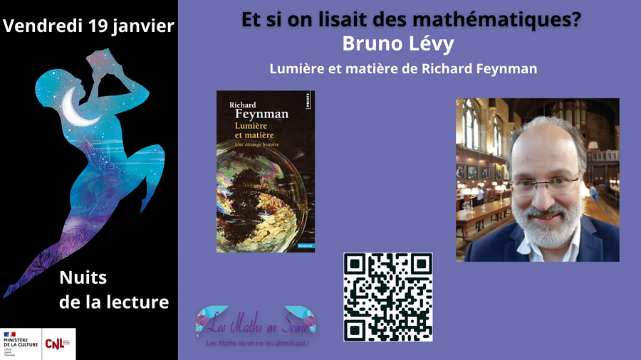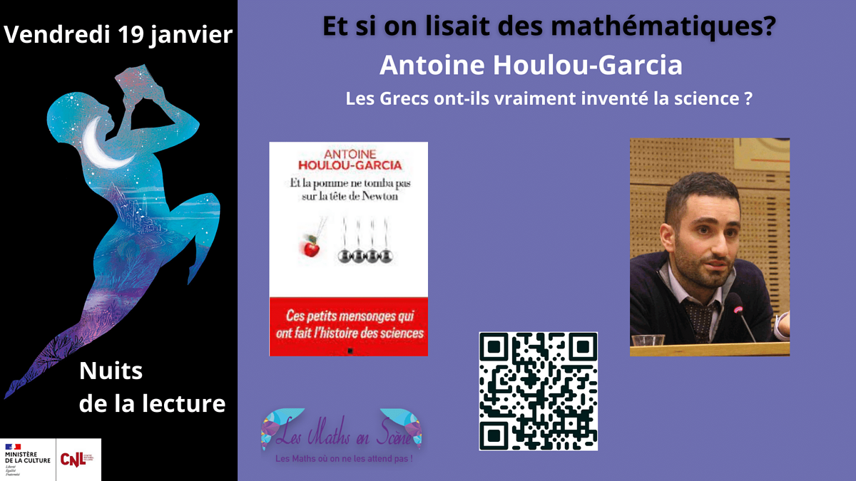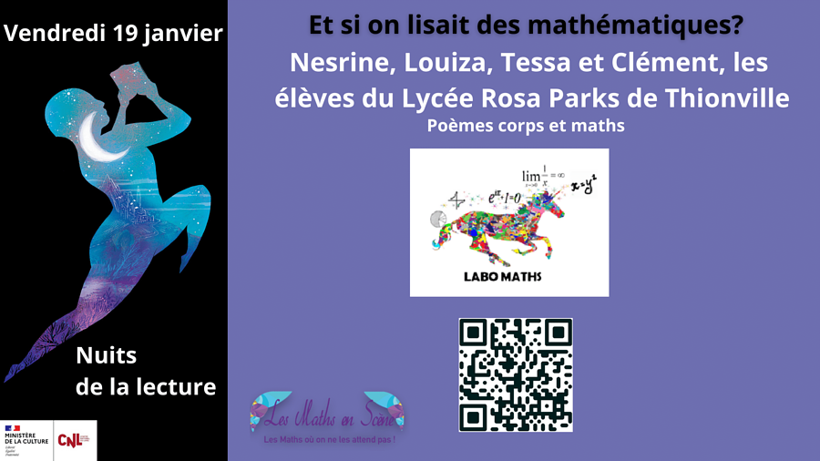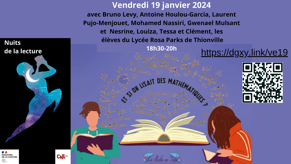 Ce vendredi 19 janvier de 18h30 à 20h30, Bruno Levy, Antoine Houlou-Garcia, Mohamed Nassiri, Gwenael Mulsant, Laurent Pujo-Menjouet et les élèves du lycée Rosa Parks de Thionville vous feront découvrir à travers des lectures la richesse et la beauté des mathématiques à travers des personnages, des objets, des anedoctes.
