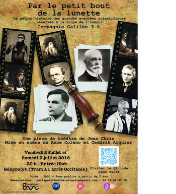 Venez découvrir une pièce de théâtre originale, présentant l'histoire des sciences comme vous ne l'avez jamais imaginée. Représentations les 8 et 9 juillet à Génopolys, face à l'arrêt du Tram Occitanie.