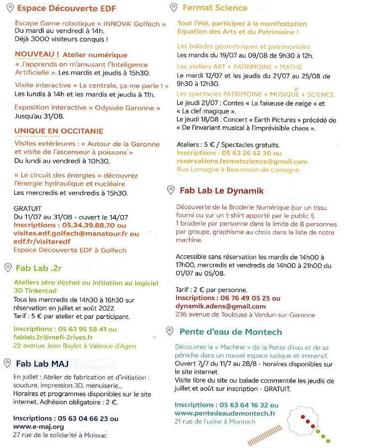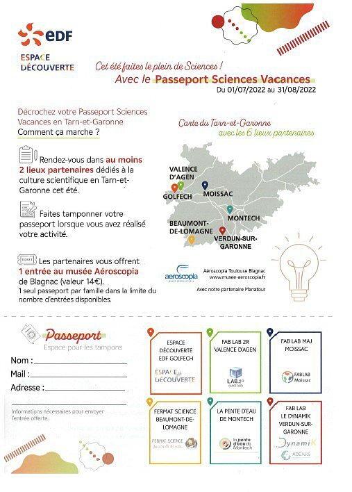 Les acteurs CSTI du Tarn-et-Garonne (Espace découverte EDF de Golfech, Fermat Science, la Pente d'eau de Montech, et les Fab Lab de Verdun-sur-Garonne, Valence d’Agen et Moissac) proposent cet été le Passeport Sciences Vacances en Tarn et Garonne.