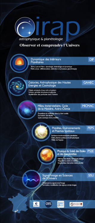 Les équipes de l’IRAP travaillent à l’étude et la compréhension de l’Univers et de son contenu : la Terre en tant que planète, son environnement spatial, le soleil et ses planètes, les étoiles et leur système planétaire, le milieu interstellaire, les galaxies, les objets compacts, les tout premiers astres et le Big Bang primordial.