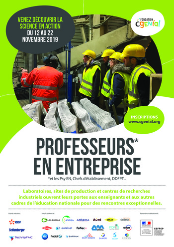 La Fondation CGénial propose aux enseignants du secondaire et autres cadres de l’Education nationale (chefs de travaux, chefs d'établissements, psy EN, etc) de visiter des sites de production, d'innovation ou de recherche et développement sur l’ensemble du territoire national.