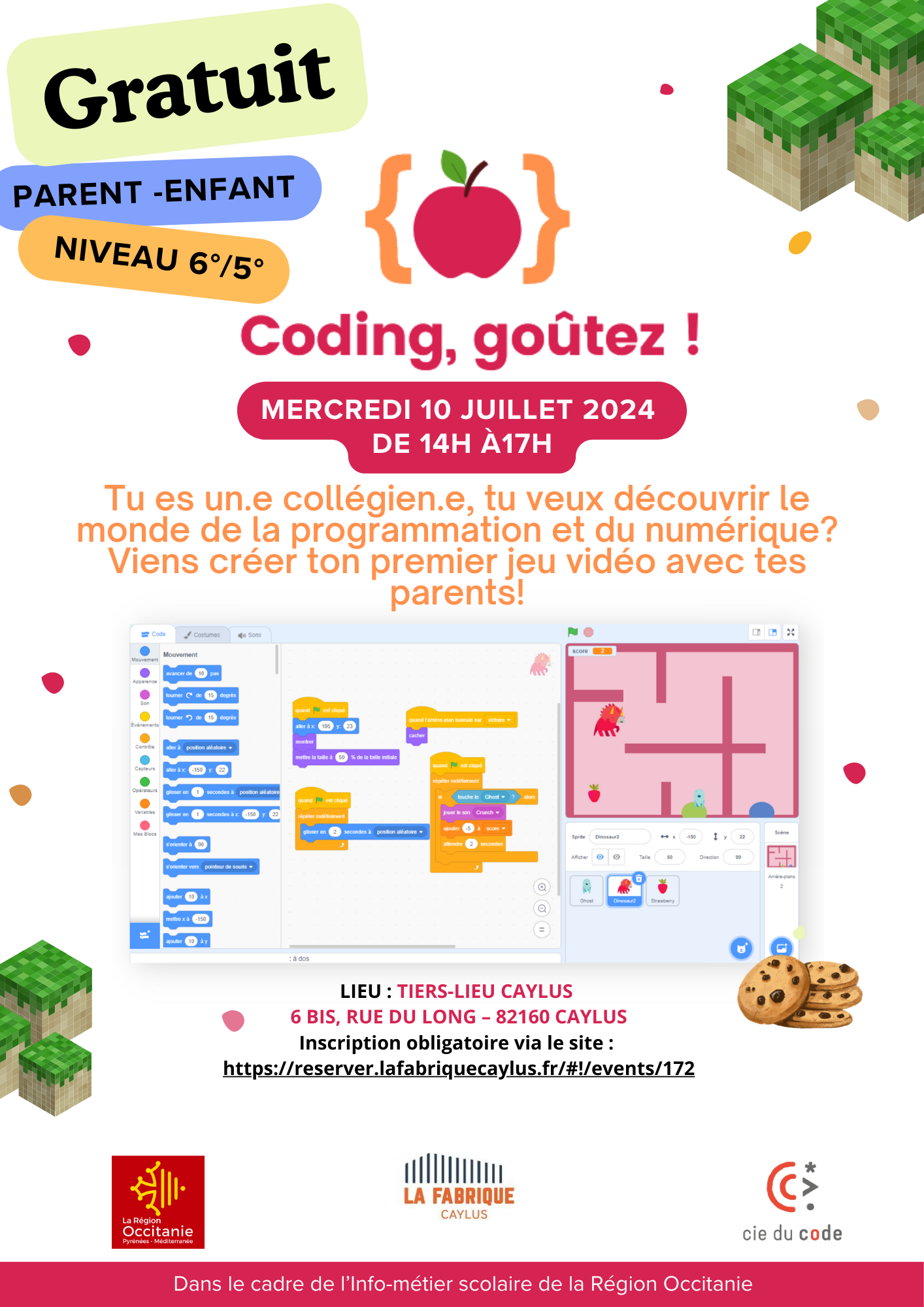 Viens avec l’un de tes parents créer ton premier jeu vidéo en langage simplifié par blocs et découvrir les métiers qui te font rêver à la Fabrique Caylus !